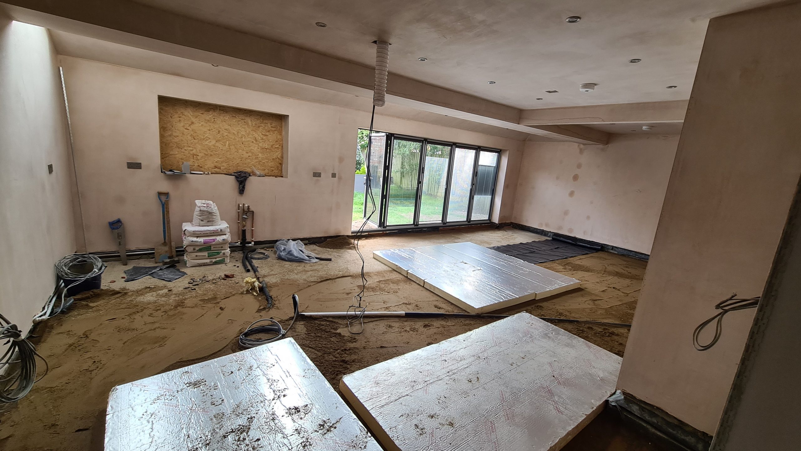 Walls are down, floor taken up and plastering done. Underfloor heating going in tomorrow. Building Work – Project 3 – Weeks 8 and 9